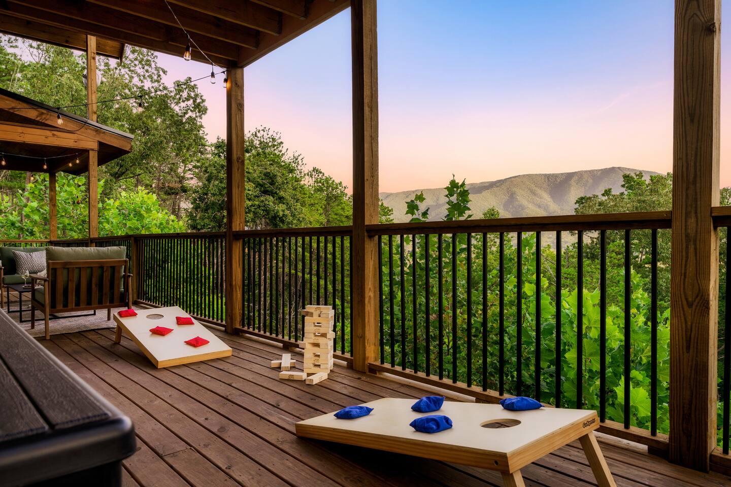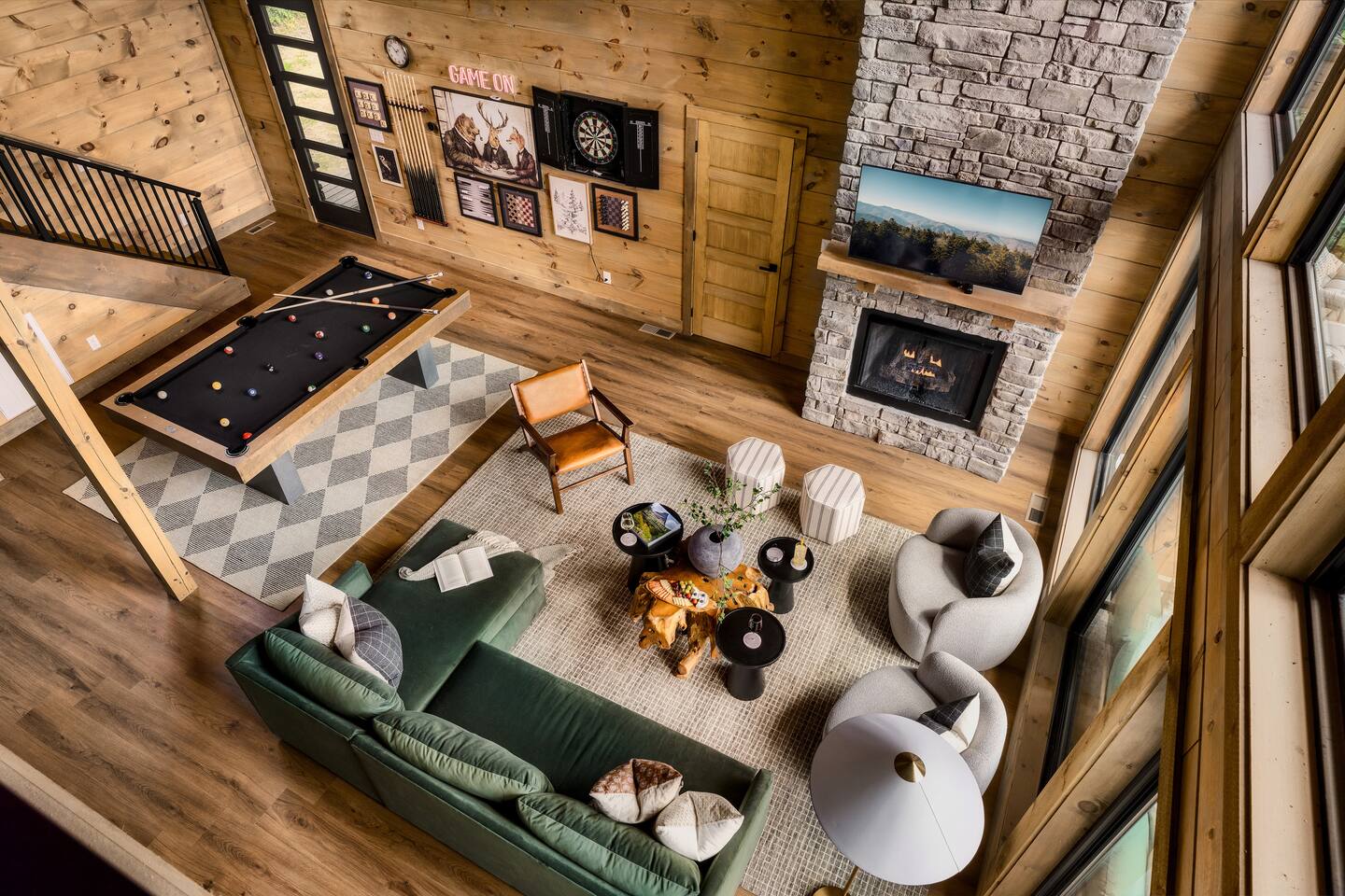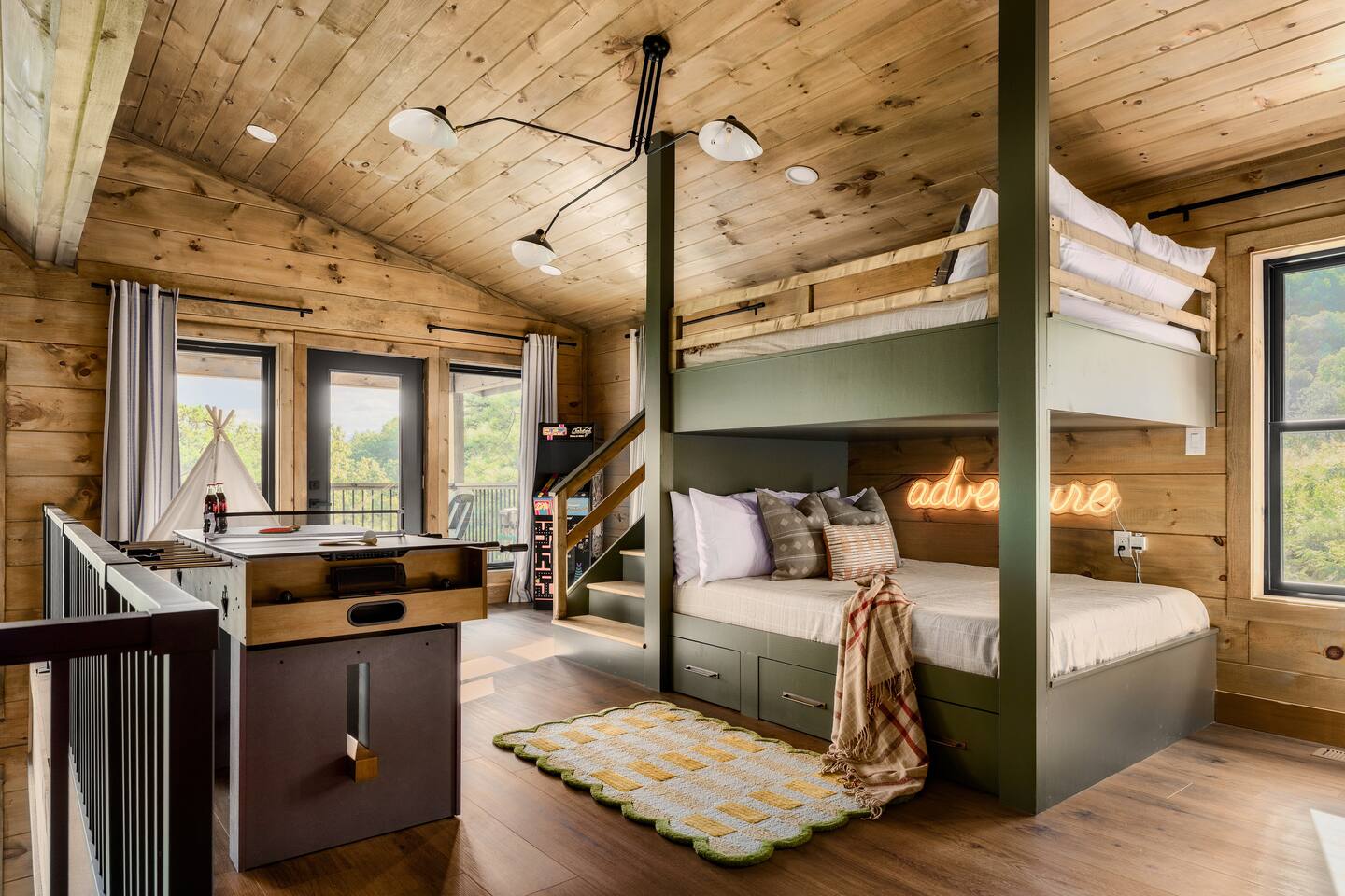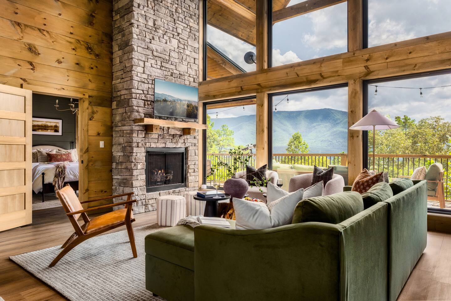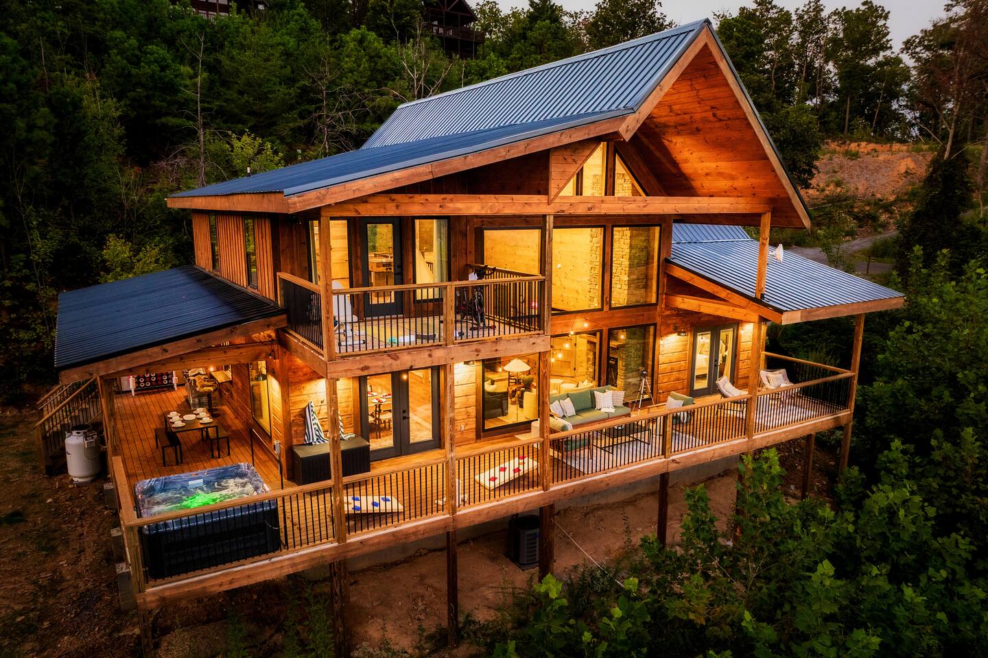 Modern cabin with hot tub views, game loft, and stylish interiors near Pigeon Forge & Gatlinburg.