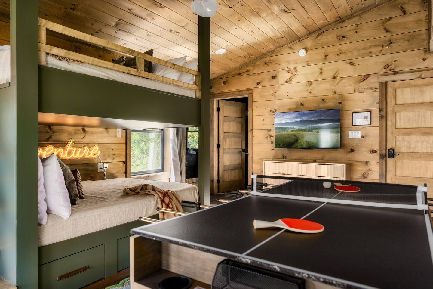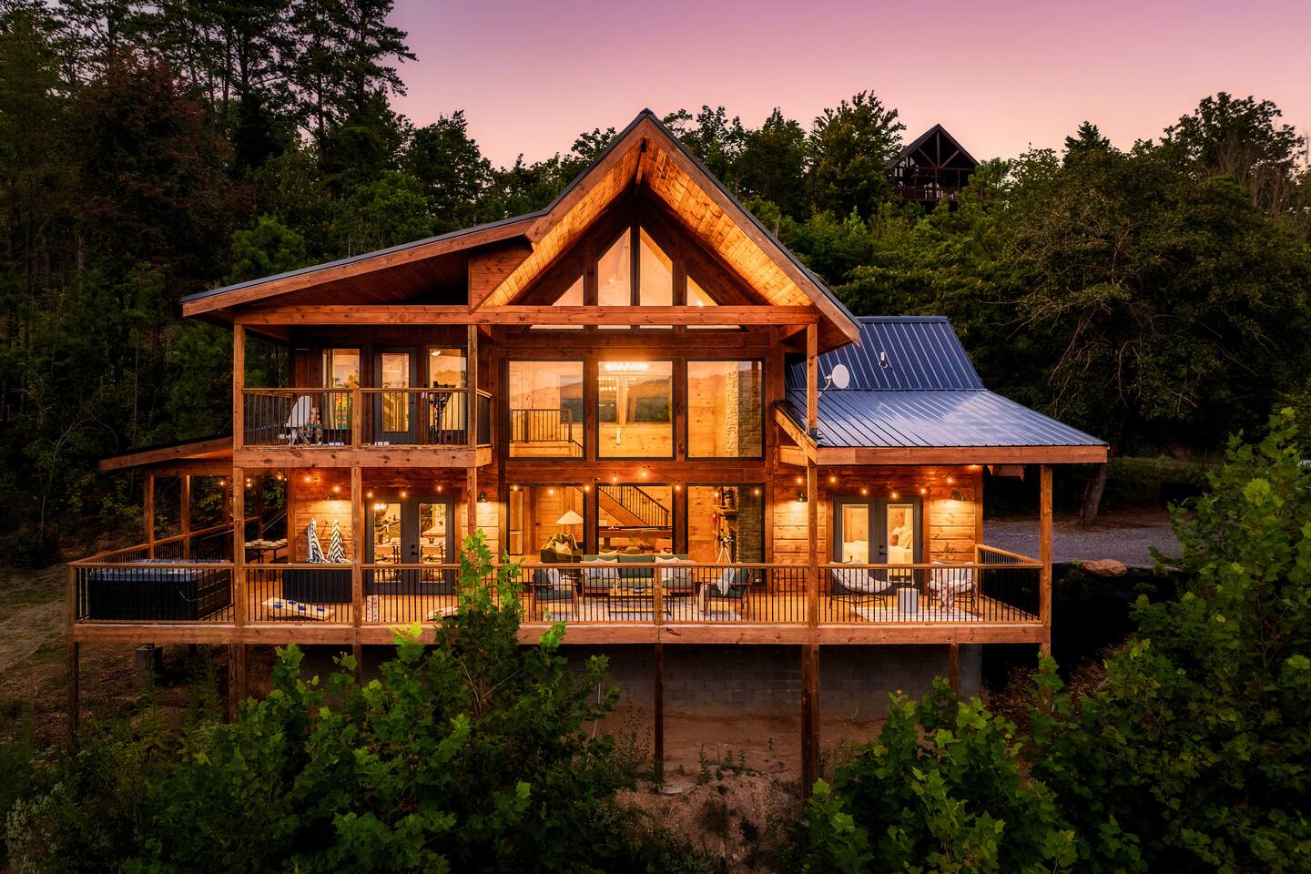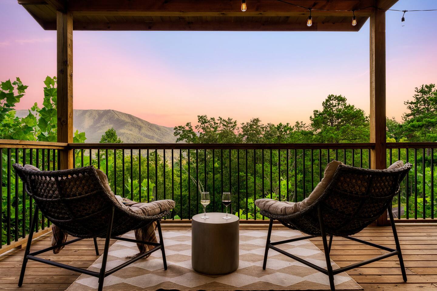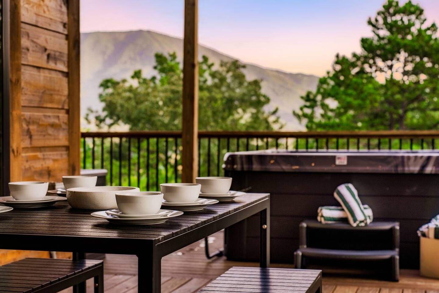 Modern cabin with hot tub views, game loft, and stylish interiors near Pigeon Forge & Gatlinburg.