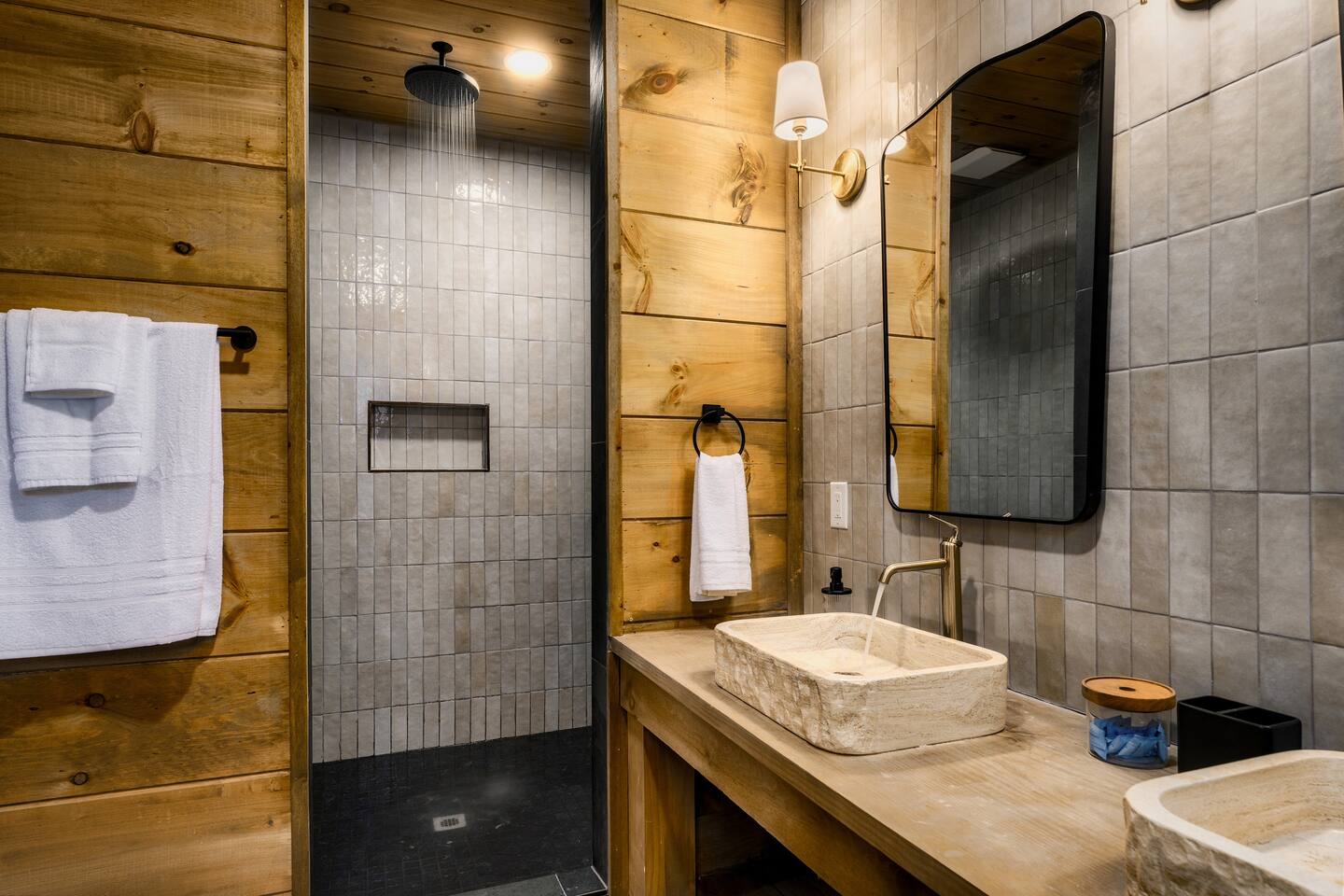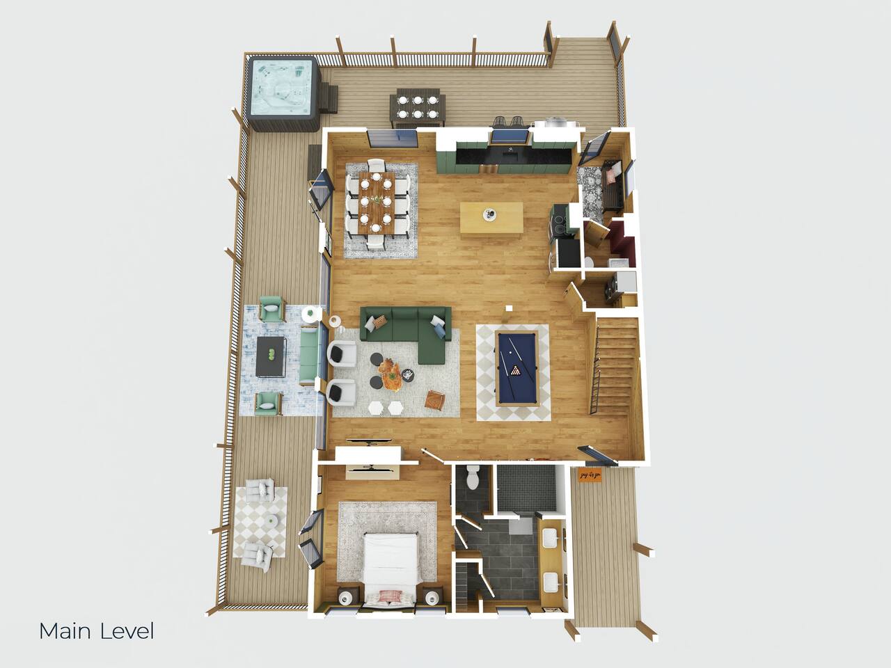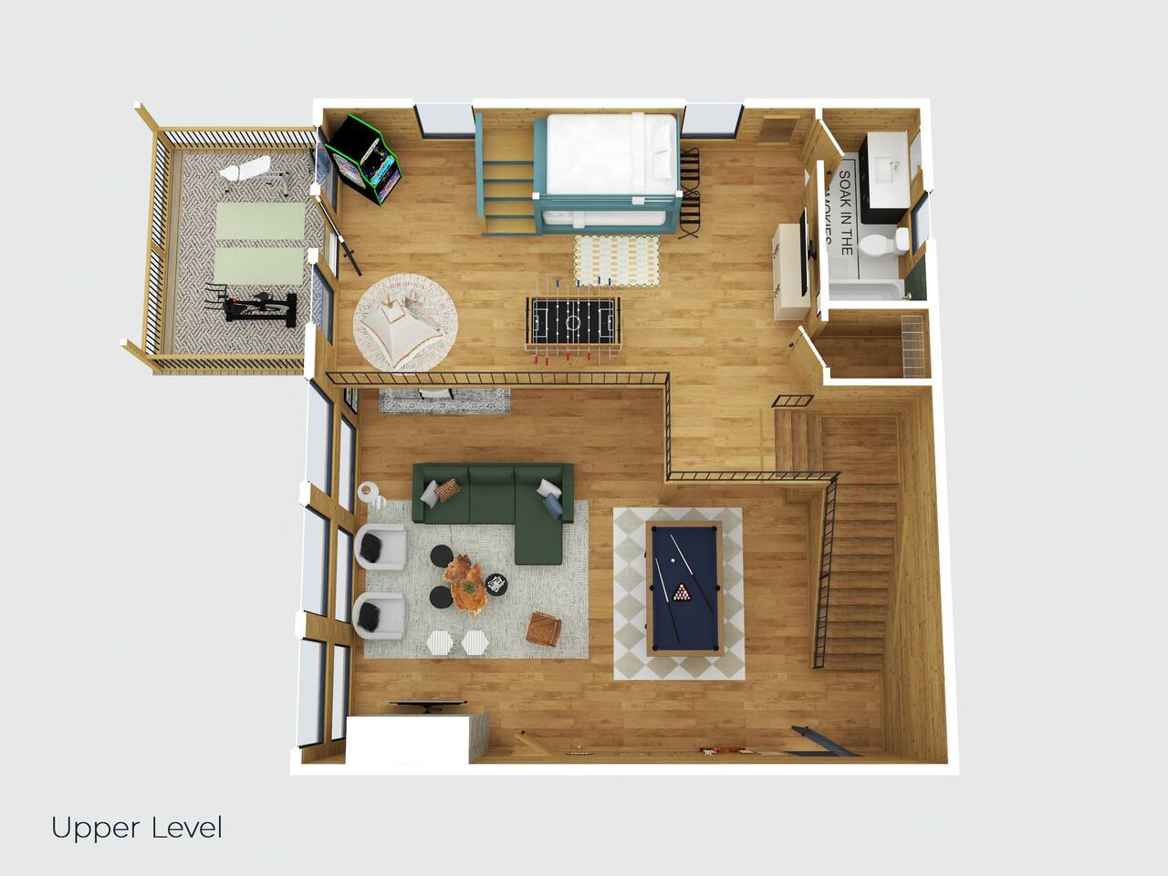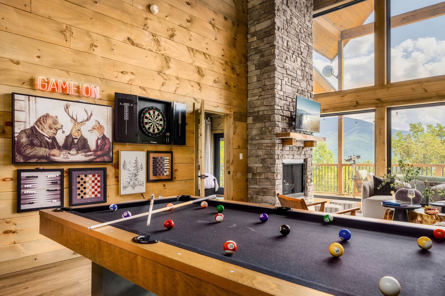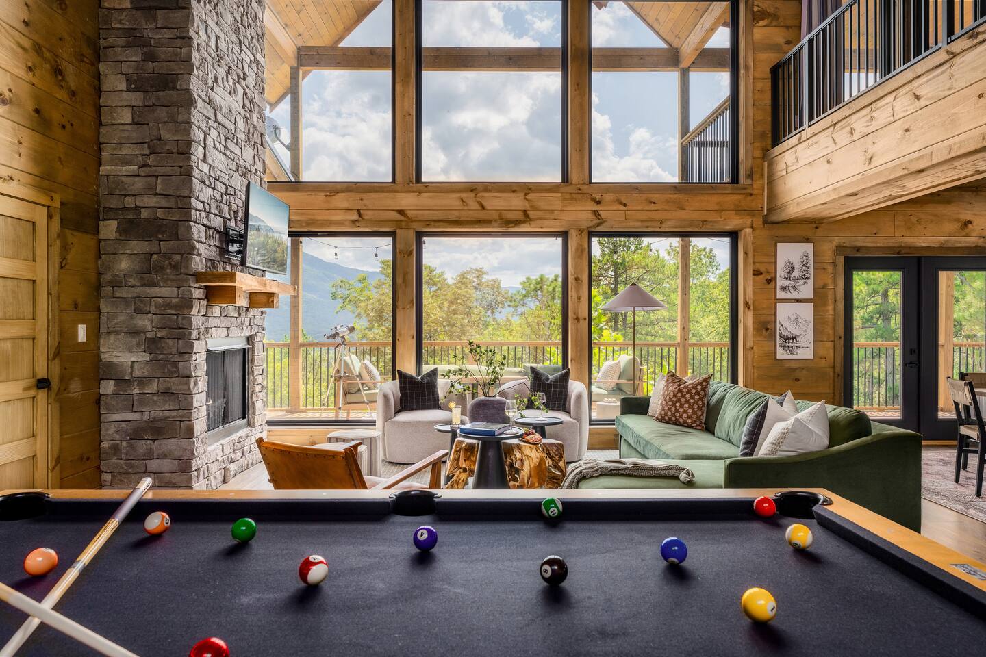 + Primary suite with queen bed + Primary bath with rain shower and double sinks + Upstairs loft bedroom with queen over queen bunk beds and unobstructed views of the mountains. + Upstairs gaming table + Upstairs full bathroom with shower/tub combo + Additional queen sleeper sofa in the living room + Fully equipped kitchen: Keurig + Drip Coffee, toaster, crockpot + Gas fireplace + Game Room with full size billiards table + Large Porch with hot tub and mountain views + High speed Wi-Fi and 3 smart TVs + Contactless self check-in + Parking for 3+ vehicles Two bedrooms, two & a half bathrooms, and an additional pullout queen sleeper sofa located throughout the 2 stories, Chara Vista Cabin accommodates 8 comfortably. When you enter the cabin you will notice a full wall of large windows that show stunning views of the Smoky Mountains. This retreat is ideal for couples, families, & friends looking for a mountain getaway. Chara Vista offers its guests seclusion without being far from the area attractions! The main level features the primary suite with full bathroom, living room with gas fireplace, washer/dryer, a well-equipped kitchen, game room, and a dining table that seats 8. There is also a deck off the main level that overlooks the mountains, making it the perfect place to spend a quiet morning drinking a cup of coffee or enjoying a glass of wine in the evening. You will also find a hot tub on this deck and a gas grill. The upper level features a loft bedroom open to the downstairs and the big windows with stunning views of the mountains, full bathroom, wellness deck, and arcade.